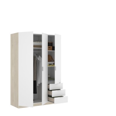 Armario de 3 puertas y 3 cajones realizado en tablero Laminado de alta calidad de 16 mm. de grosor y acabado color roble imitando la veta de la madera la base y los costados y las puertas y cajones acabado color blanco.
